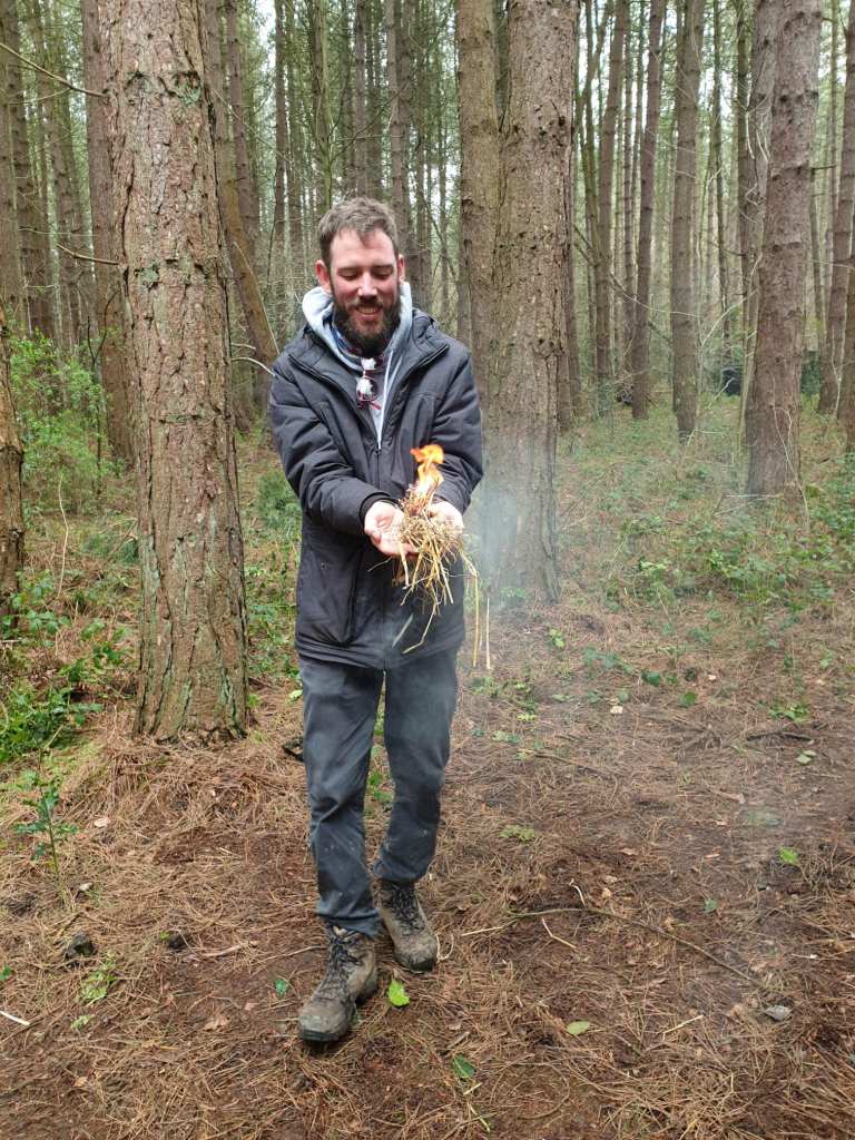 The group took part in various fire making skills and techniques, knot tying, water filtration, shelter building, trying natural edibles like pine needle tea, dandelions, gourse flowers and some critters, as well as preparing a whole pigeon and using it to cook a campfire dish!